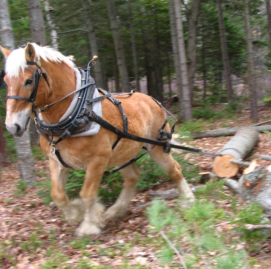 Logging is hard and dangerous work. After woodsmen chop down trees, horses pull the logs to landings in the woods. |